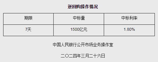 据中国人民银行网站消息配资好做吗,为维护季末流动性平稳配资好做吗,2024年3月26日人民银行以利率招标方式开展了1500亿元逆回购操作。具体情况如下: