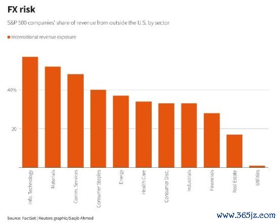 不过,并非所有标普500指数成份股公司都受到美元波动的同等影响。FactSet的数据显示,信息技术、材料和通信服务行业的国际收入敞口最大,分别占其总营收的57%、52%和48%。
