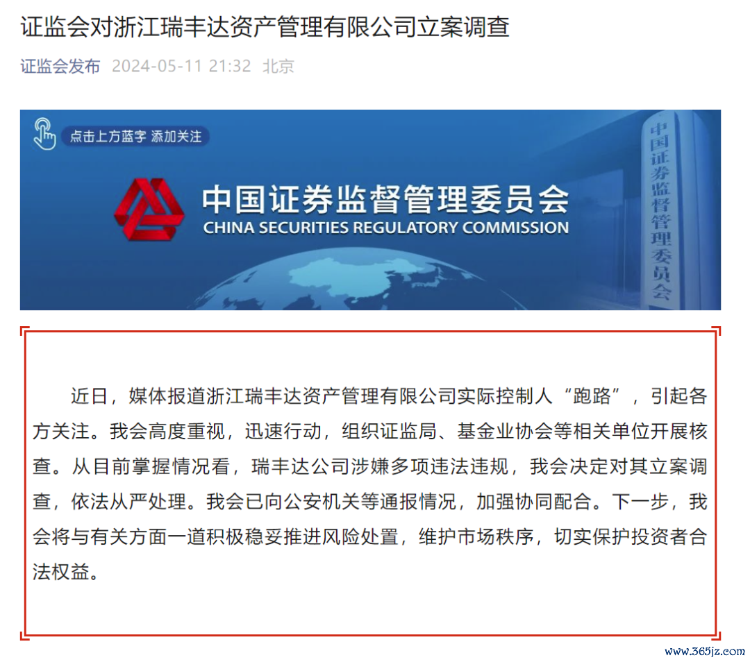 证监会对浙江瑞丰达资产管理有限公司立案调查