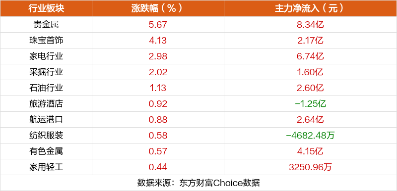板块方面,贵金属、珠宝首饰、家电行业等板块涨幅居前,电池、保险、光伏设备等板块跌幅居前。