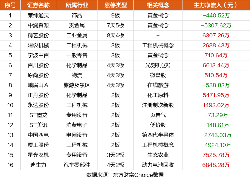 其中,黄金概念莱绅通灵9板,黄金概念中润资源7天5板,精艺股份8天4板。