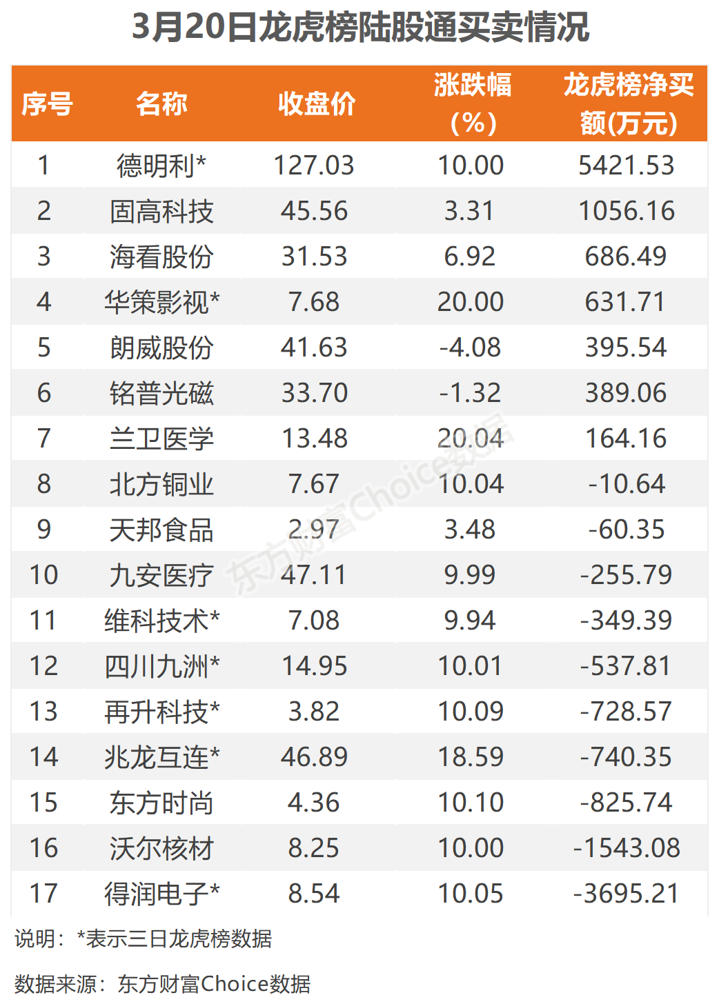 3月20日,陆股通参与龙虎榜中个股共涉及17股,其中7股被陆股通净买入,德明利被买入最多,三日净买入5421.53万元;另外10股被陆股通净卖出,得润电子被卖出最多,三日净卖出3695.21万元。