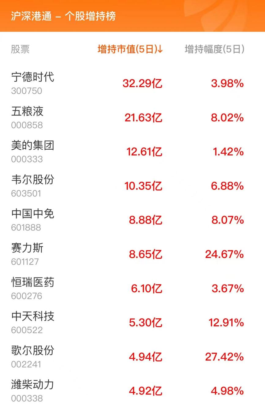 北向资金个股增持榜